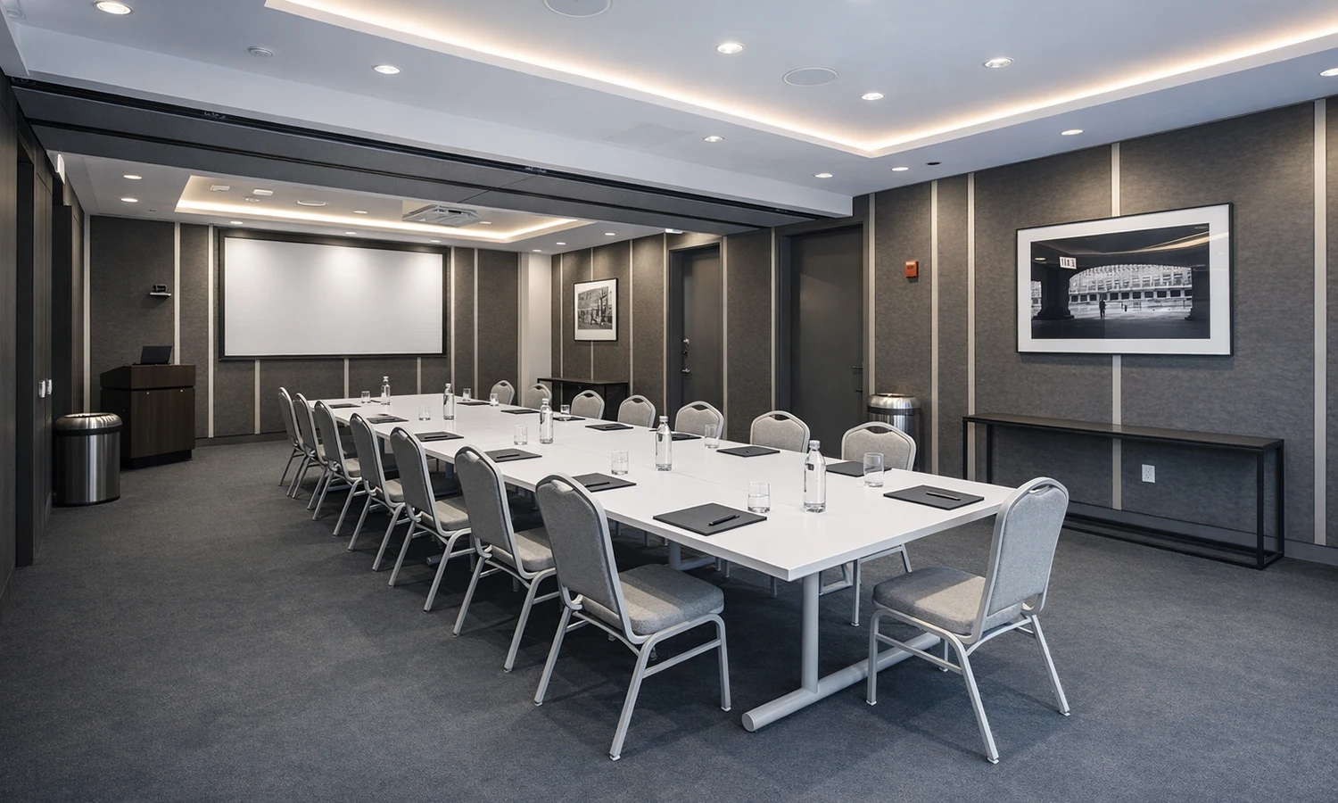 Full AV capabilities include video/audio conferencing, two 60-inch flat-screen television monitors, a drop-down projector and 144” screen, podium, microphones, built-in speaker system and more!
