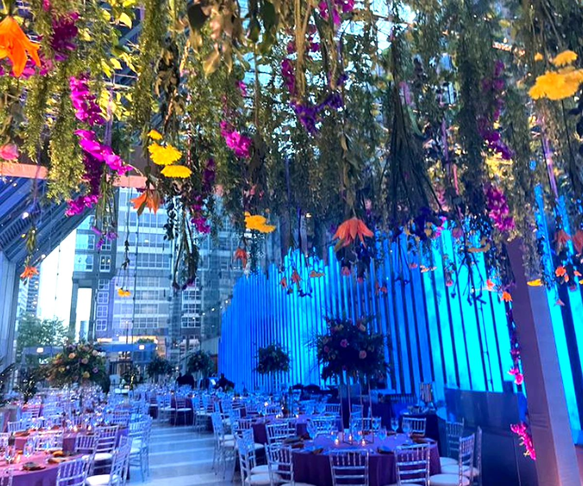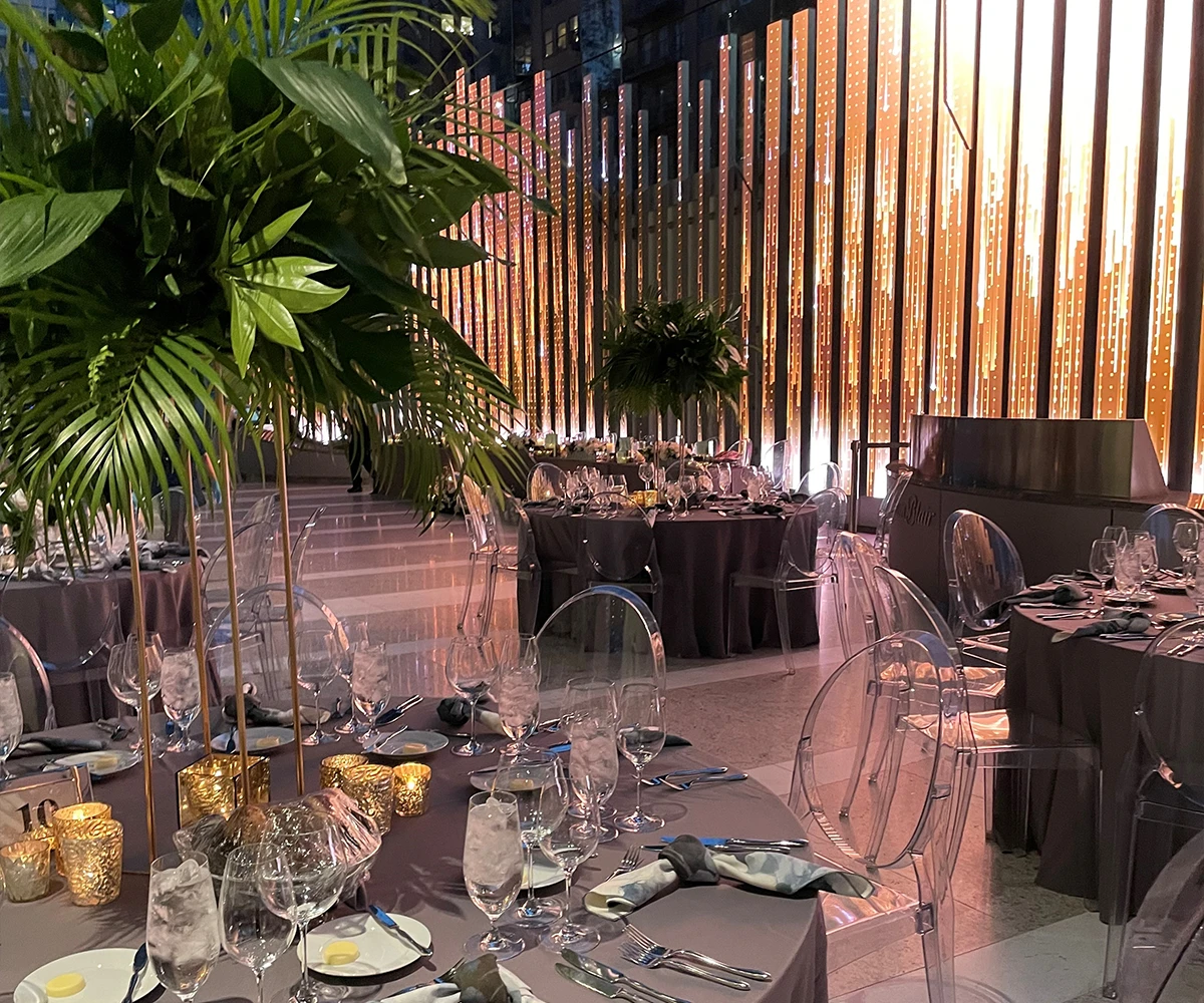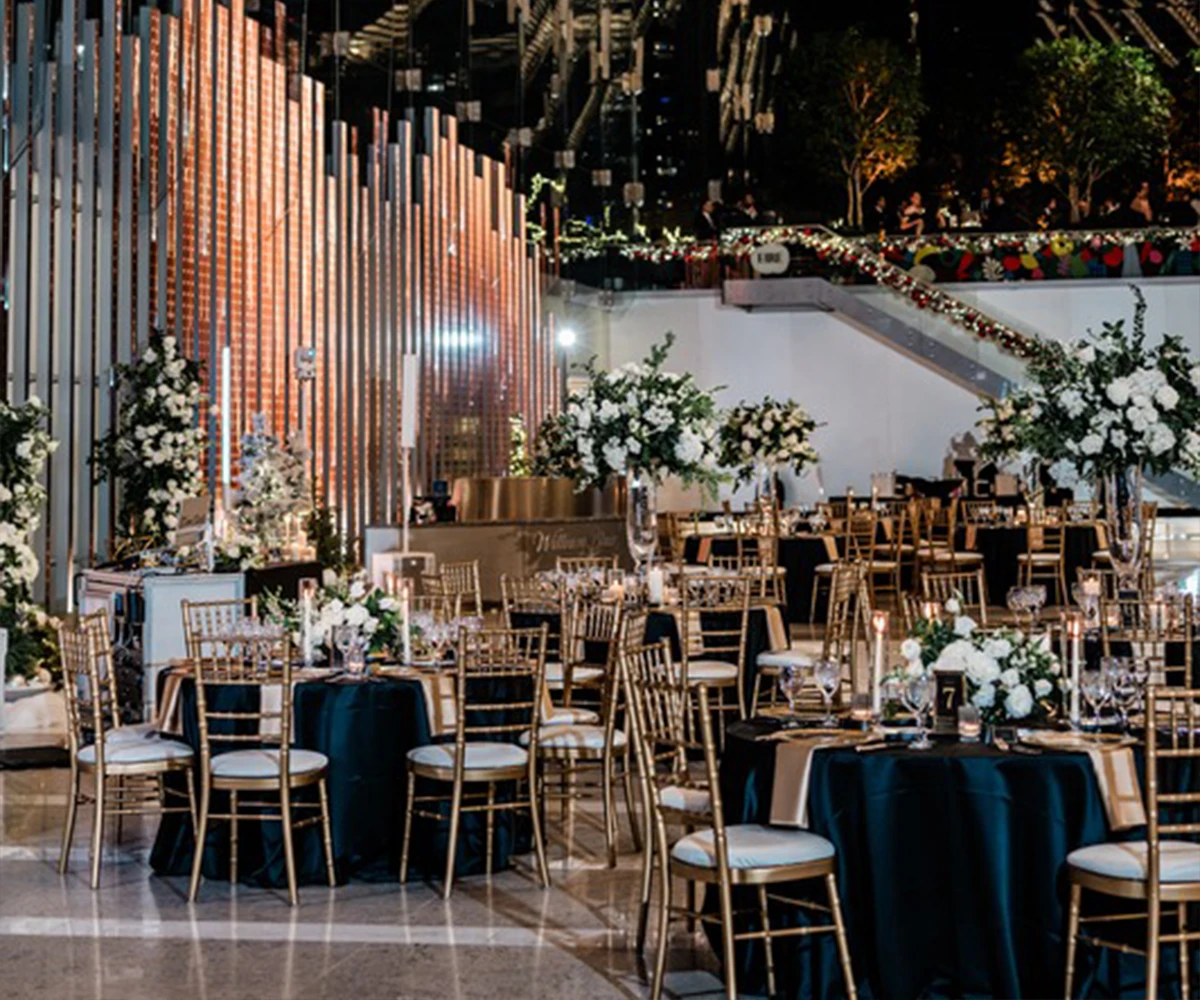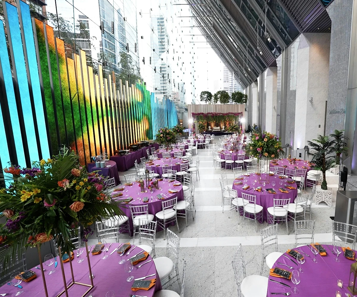Welcome your guests in a breathtaking 90-foot-high glass lobby. Home to the world’s tallest non-structurally supported glass-only wall. This soaring architectural masterpiece creates an unforgettable first impression. A 150-foot-long multimedia art wall, featuring vibrant digital displays from local and international artists across 89 LED blades, adds a dynamic and modern touch. Making it the perfect backdrop for weddings, receptions, and standout social events.