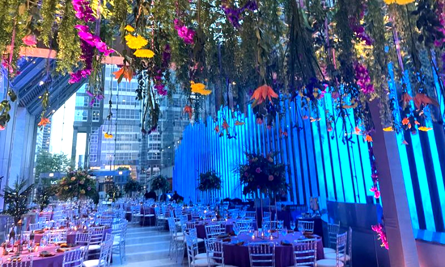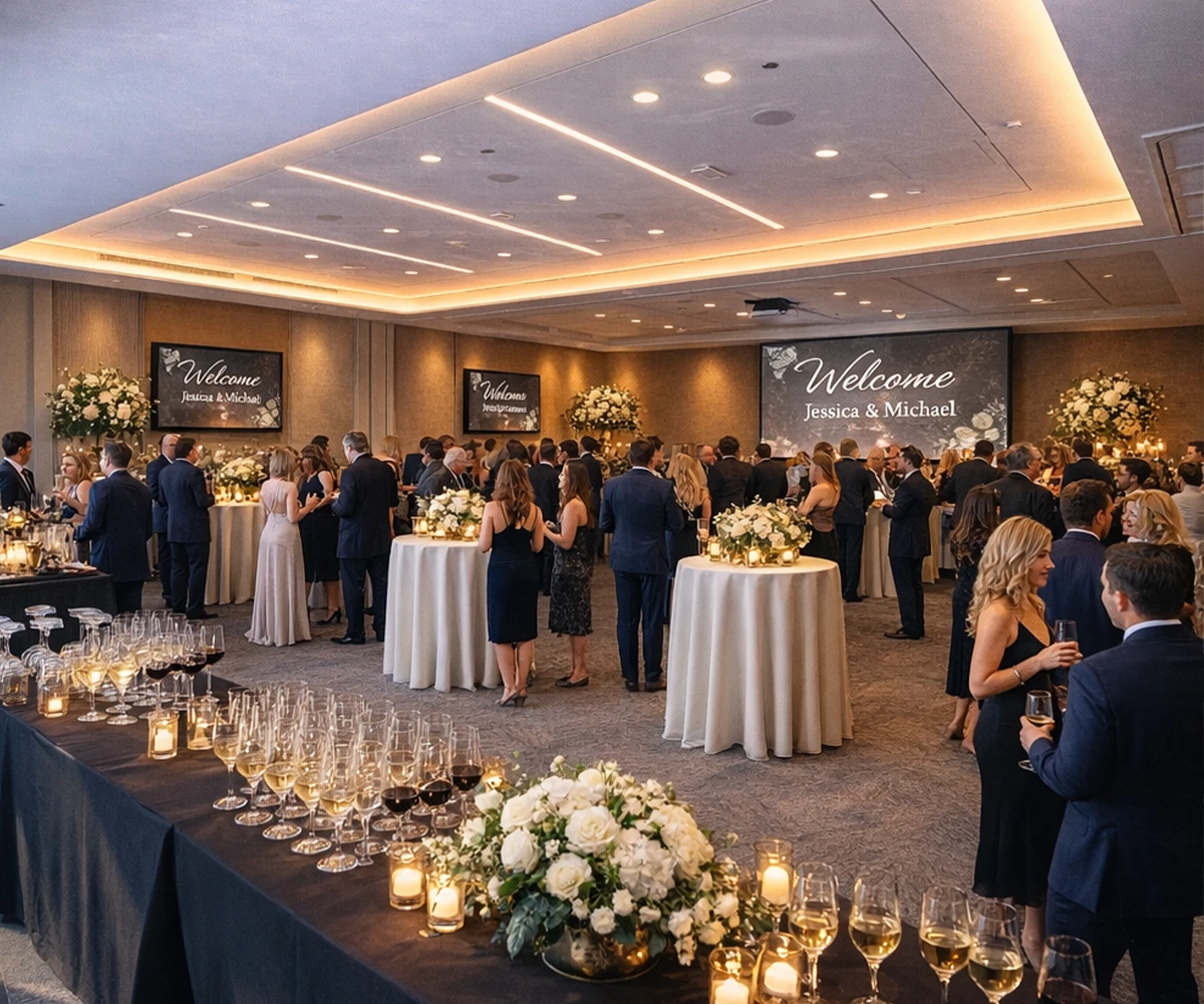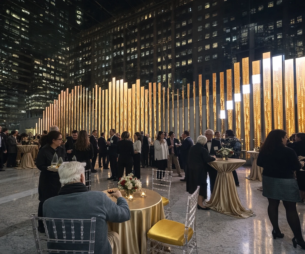 Welcome your guests in a breathtaking 90-foot-high glass lobby. Home to the world’s tallest non-structurally supported glass-only wall. This soaring architectural masterpiece creates an unforgettable first impression. A 150-foot-long multimedia art wall, featuring vibrant digital displays from local and international artists across 89 LED blades, adds a dynamic and modern touch. Making it the perfect backdrop for weddings, receptions, and standout social events.