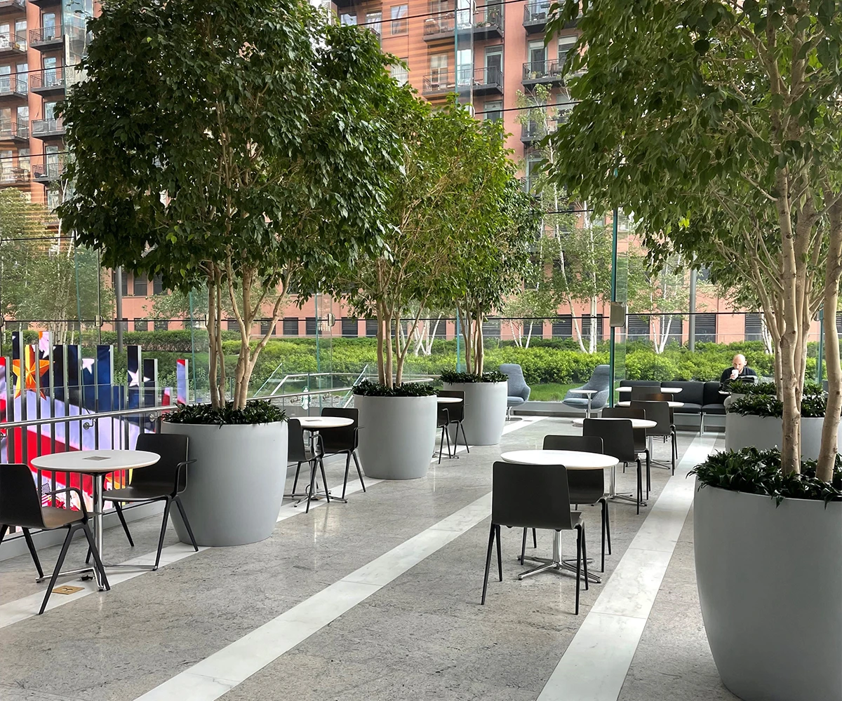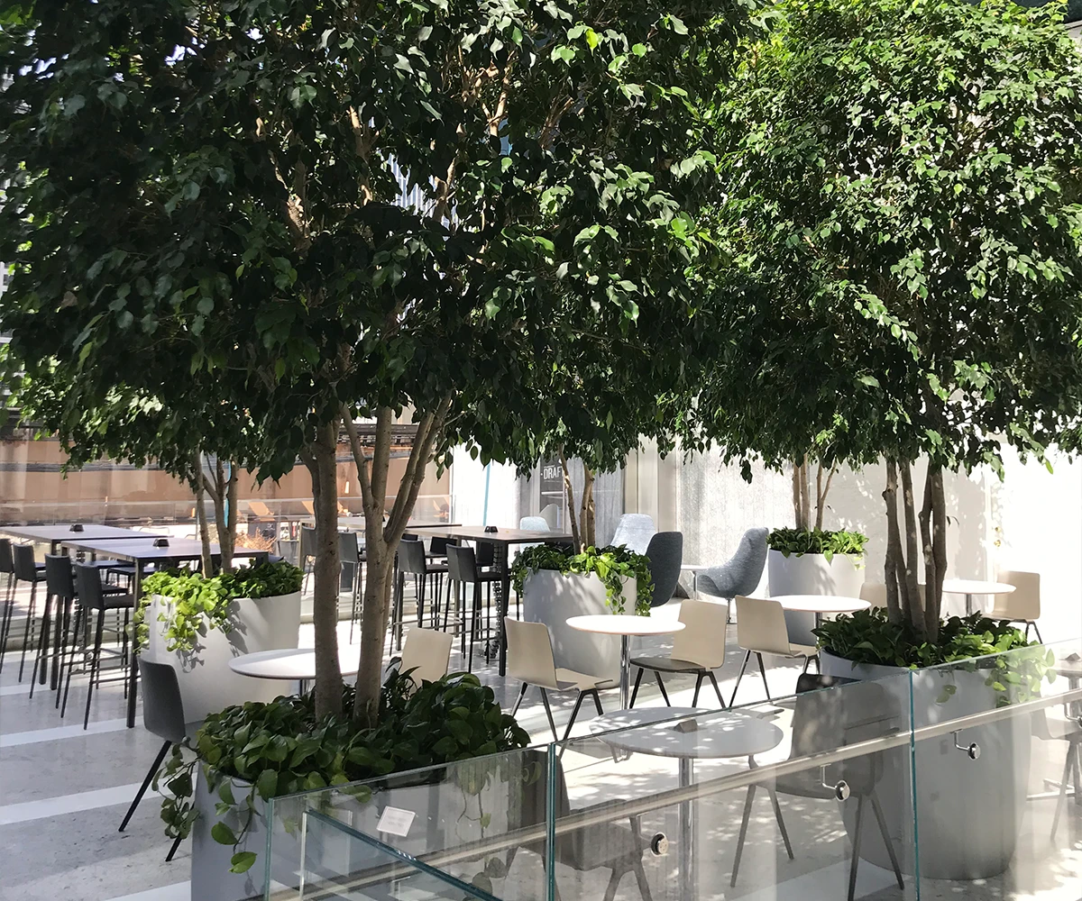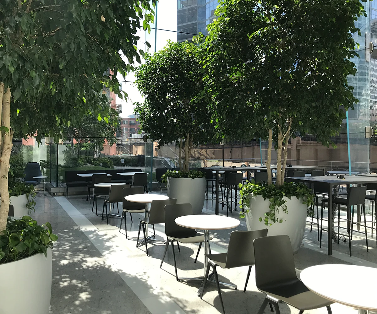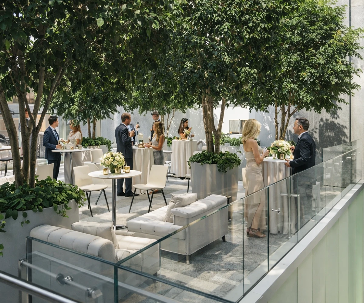 This beautiful balcony overlooks our stunning lobby and shares the space’s majestic high ceilings and abundant natural light. The surrounding glass walls and views of the garden make it the perfect venue for any occasion.
