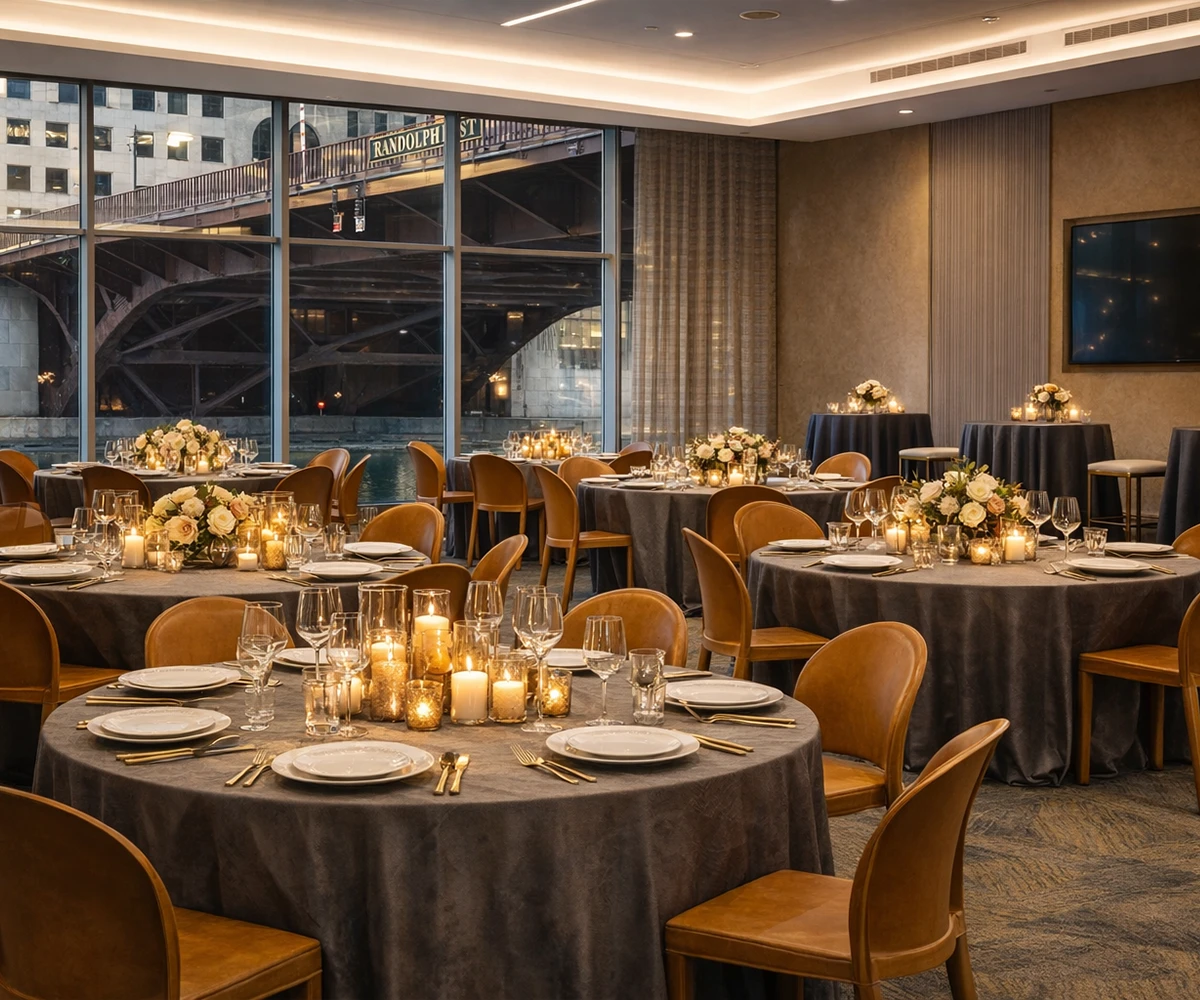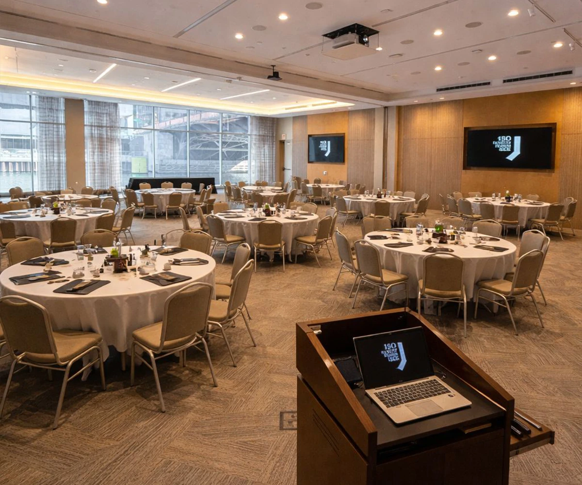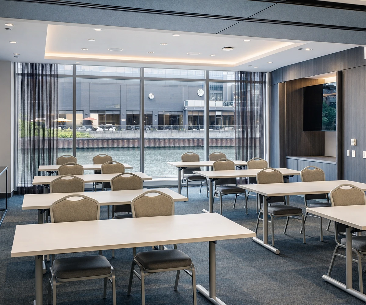 Elevate your next corporate gathering in our Grand Century Ballroom, where stunning riverfront views meet modern sophistication. With floor-to-ceiling windows showcasing downtown Chicago, this spacious venue accommodates up to 200 guests reception style. Whether you’re hosting a board meeting, multi-day conference, seminar, or reception, the ballroom offers AV capabilities, flexible layouts, and abundant natural light, creating the perfect setting for impactful and memorable events.
