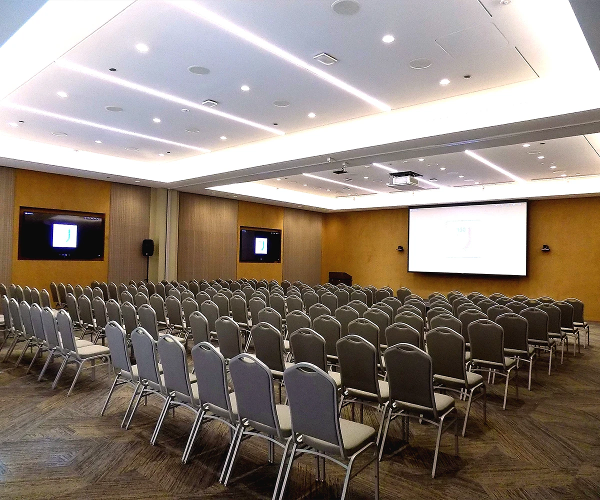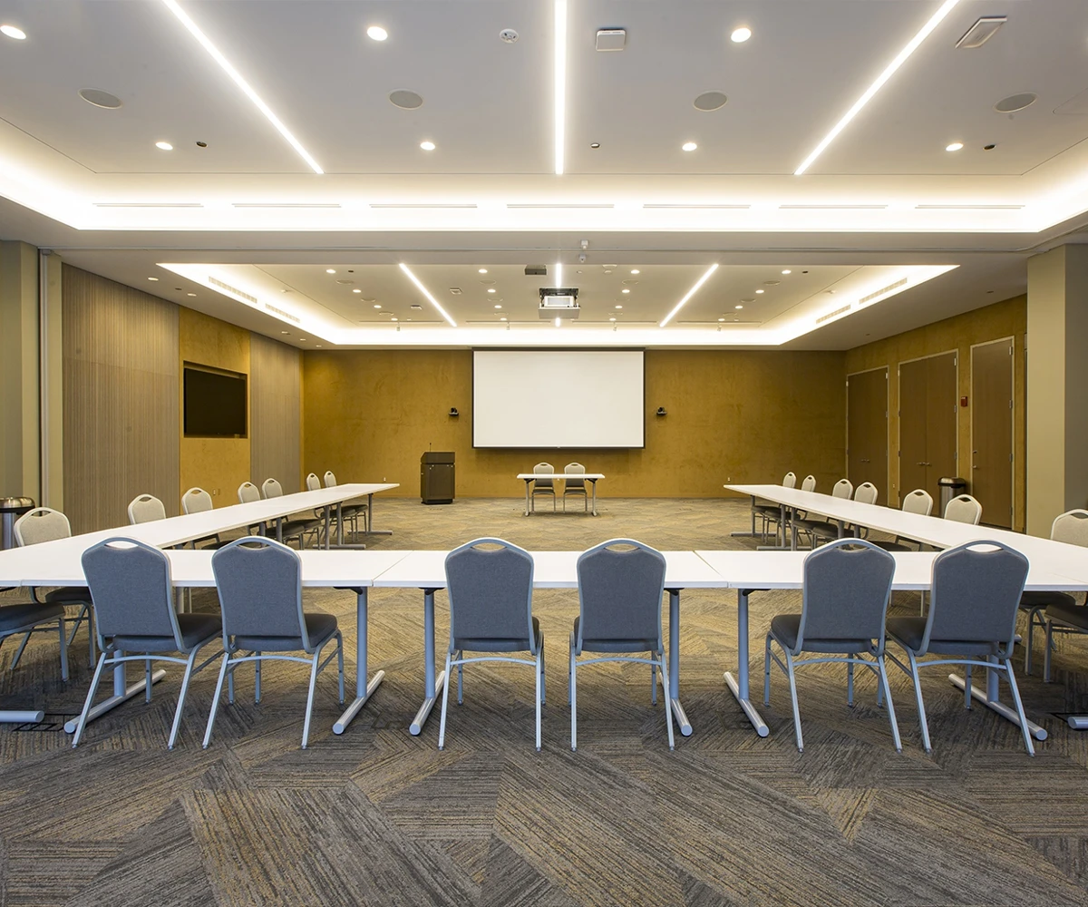 Full AV capabilities include video/audio conferencing, two 60-inch flat-screen television monitors, a drop-down projector and 122” screen, podium, microphones, built-in speaker system, and more!